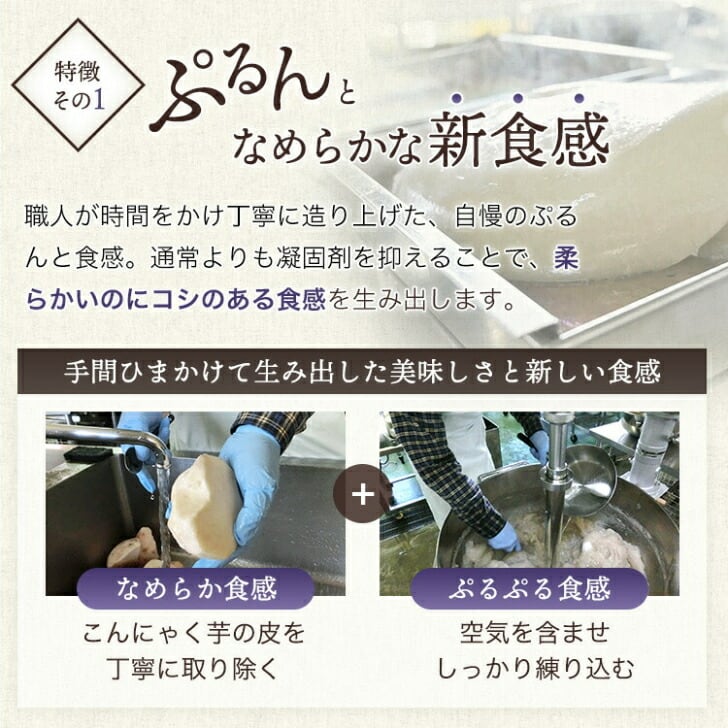 天竜川を見下ろす南信州の小さな村《泰阜村》の美味しい水と美味しい空気の中で一つ一つ丁寧に造り上げたこんにゃくは、驚くほどプルンプルンで、つるんと滑らかです。